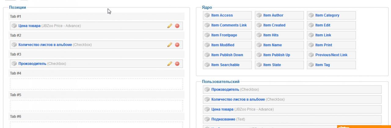 в шаблоне есть 10 табов. - Надеялся, что все элементы вставленные в таб1 - будут отображаться разом и т.п...