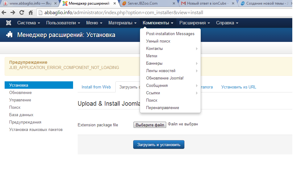 Друзья! Поздравляю с наступающим новым годом! Извиняюсь что обременяю вас в предпраздничные дни но, такая у меня проблема, не устанавливается JBZоо, я уже и на хост в корень сайта загрузила, говорит что уже все есть но в расширениях нет и где искать не знаю. Спасибо шлю скриншот. Это так все выглядит после загрузки расширения.