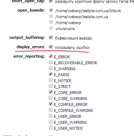 Я попробовал добавить php_value display_errors 1 в .htaccess выдает ошибку 500 белый экран. Написал в тп, сказали что это включается в панели управления. А оно и так включено оказалось.