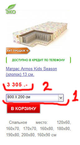 Попробуйте выбрать размер ( 1 ) должна измениться цена матраса ( 2 ).... Но, теперь (после внесенных изменений - которые предлагались тут http://forum.jbzoo.c...orziny/?p=38649 ) цена не меняется.. Если вернуть все назад, то изменение цены работает, а принудительное обновление страницы после нажатия "Очистить" в модуле корзины ( то, что требовалось) нет...