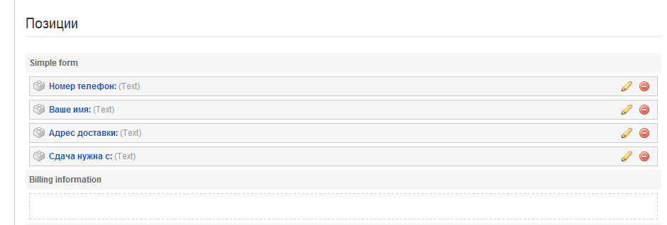 Теперь в настройках формы order form в админпанели появилась позиция "Simple form". Если перенести все нужные поля сюда, а все позиции ниже оставить пустыми то у вас получится простая форма в виде набора полей, без аккордеона.