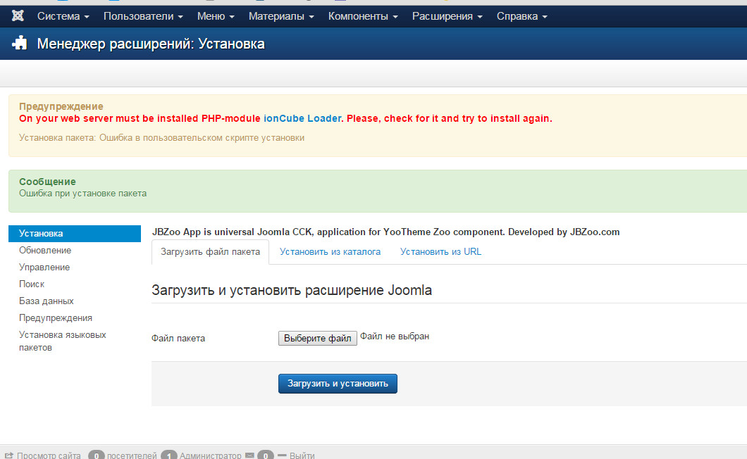 ПредупреждениеJInstaller: :Install: Не найден установочный XML-файл Joomla