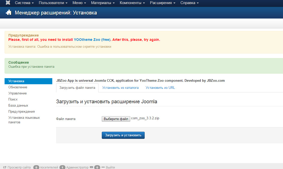 Удалил все что было, поставил Open-server. Поставил Новую Джумлу. Попытался загрузить jbzoo_app_2.1.5 который скачал с вашего сайта. Показываю скрин. Что на этот раз? Когда устанавливаю архив com_zoo_3.3.2 (этот с офсайта ютем) он встает нормально. Но jbzoo app так и не появляется. Затем следом устанавливаю архив jbzoo_demo_2.1.5 Джумла пишет